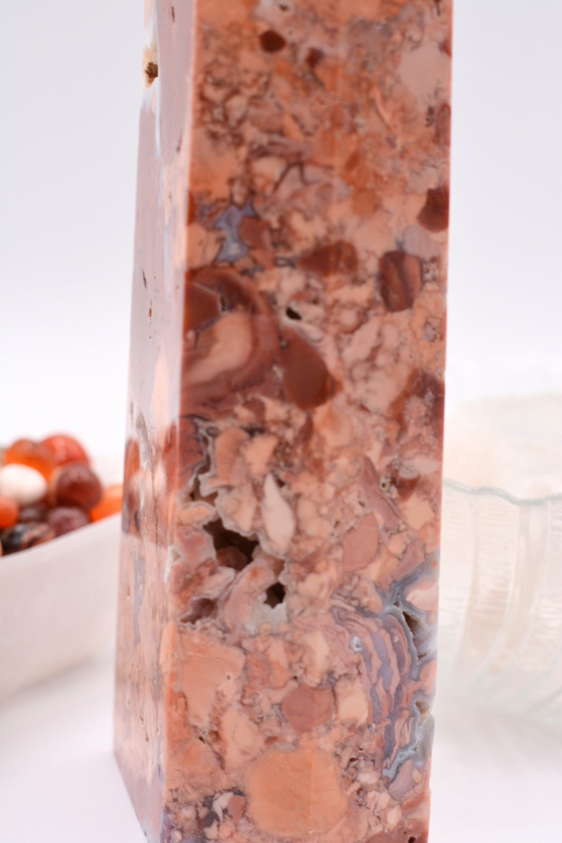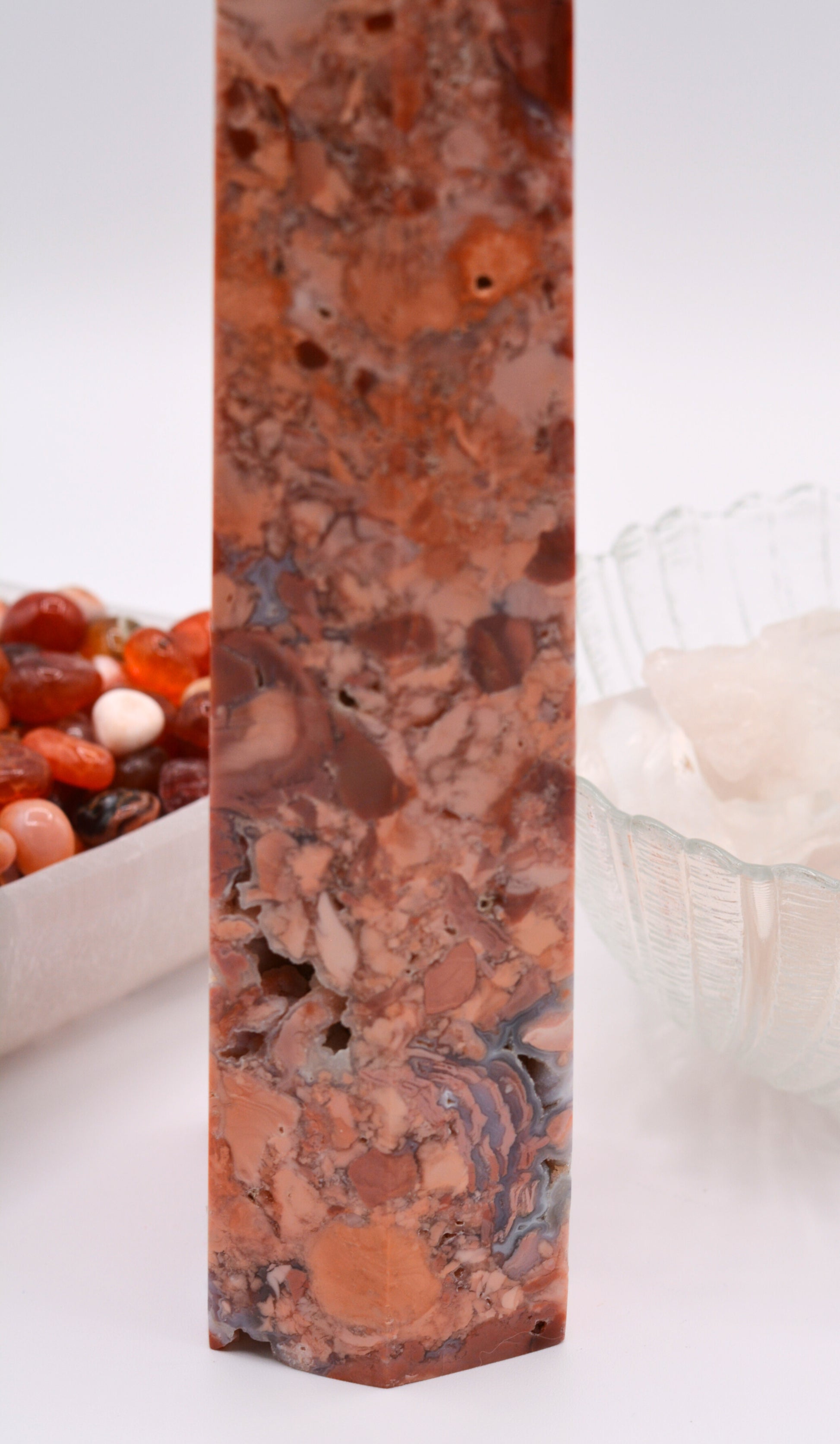 This stunning, large tower features a beautiful mix of pinks, blues, and creams as well as druzy pockets on all sides. This tower stands at 12 and 3/4" tall, 2.5" wide - main character energy!