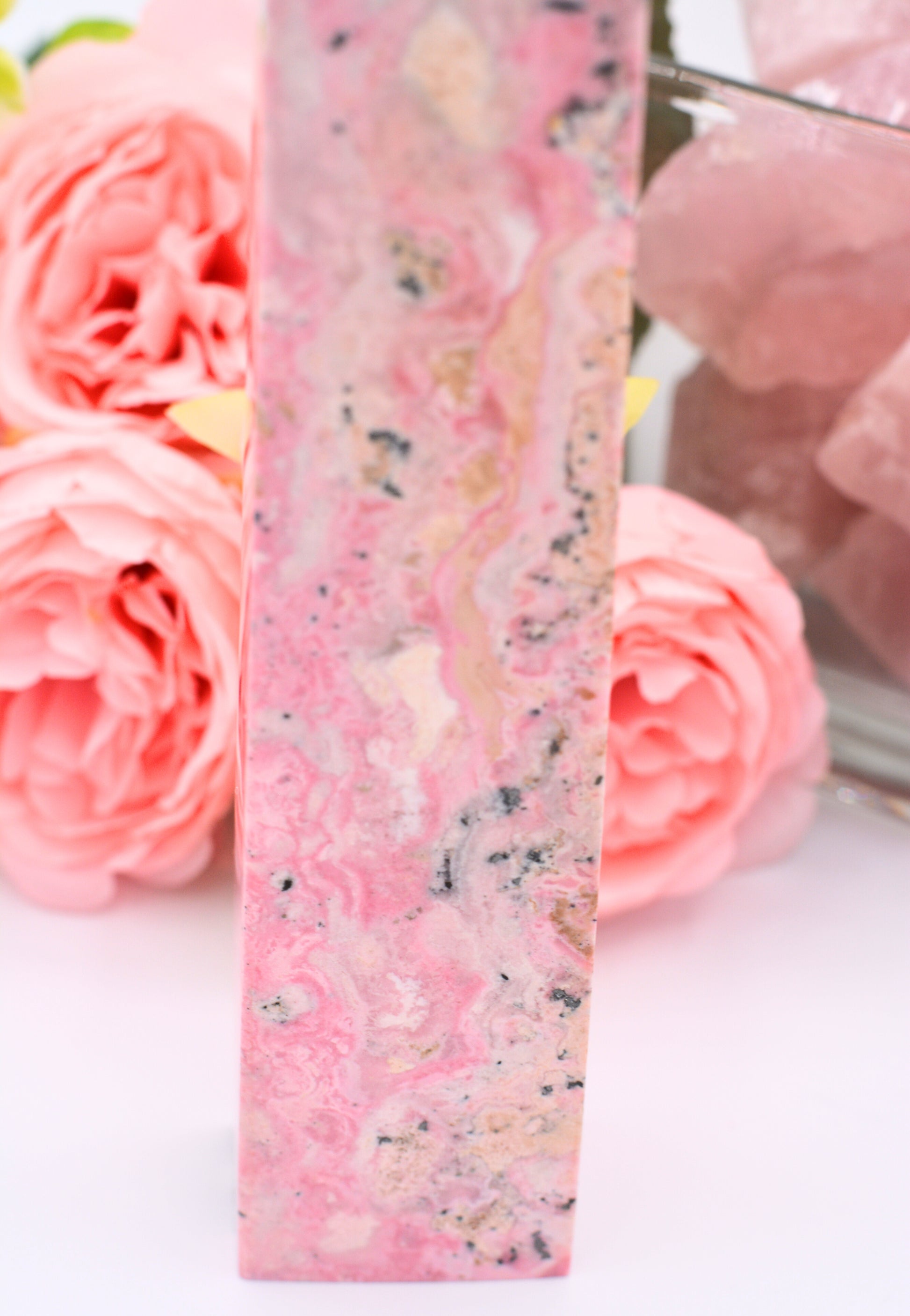 This beautiful bubblegum pink Rhodonite tower from Peru stands at about 9.5" tall. While not pictured, this tower does have a slight lean (side depends on which direction you display it), but it does stand on its own.